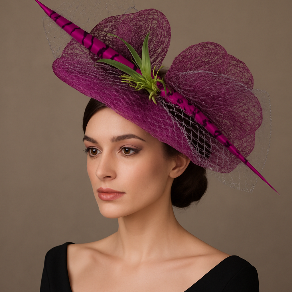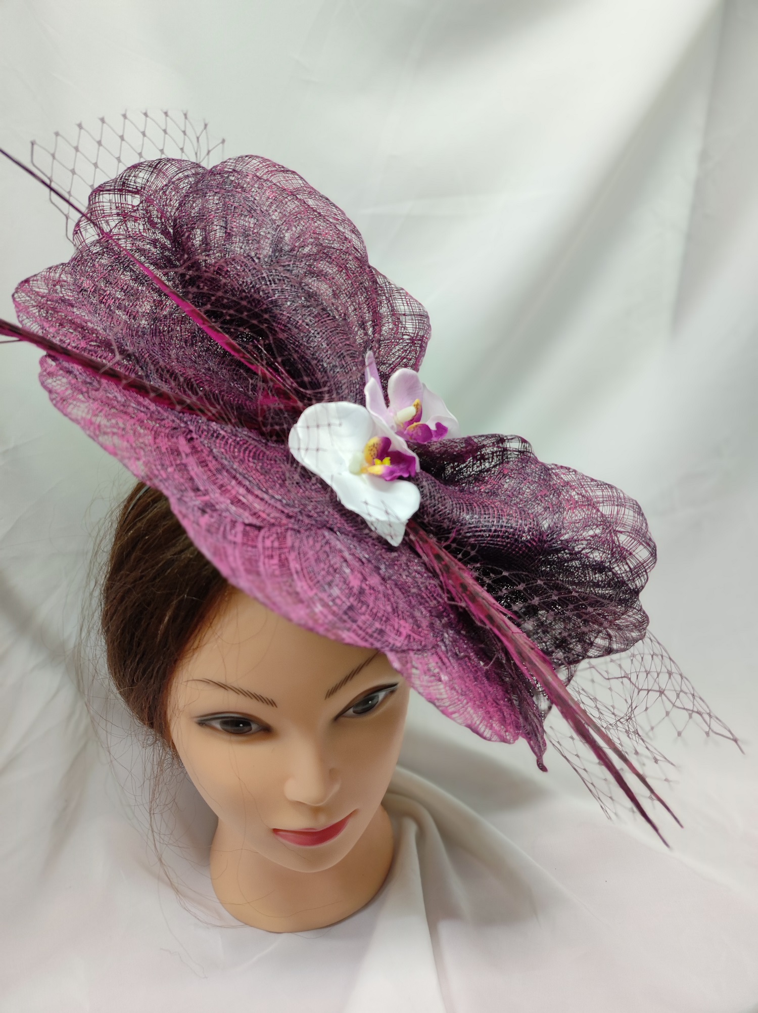 Tocado lateral, hecho artesnalemnte con sinamay rejilla pintado, y adornado con plumas, y/o flores.